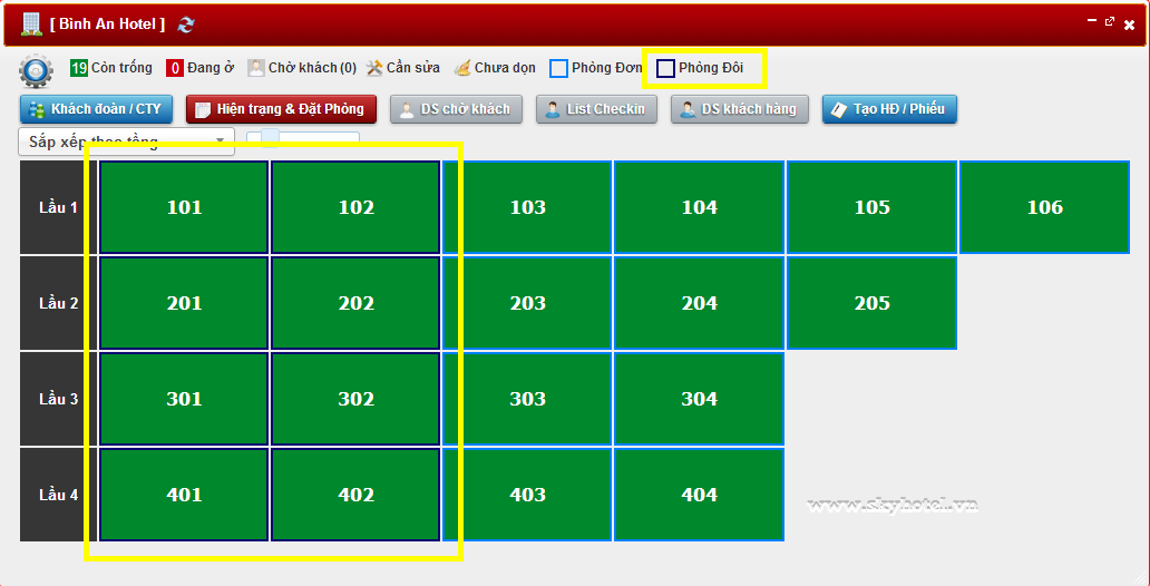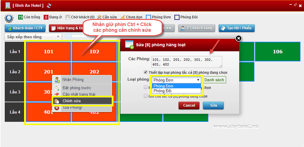 Vào sơ đồ khách sạn > Giữ phím Ctrl + nhấp các phòng cần áp loại phòng > Chỉnhsửa > Chọn loại phòng > Sửa