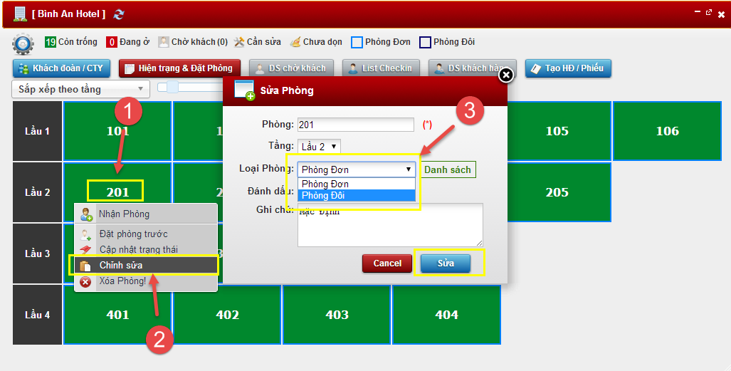 Vào sơ đồ khách sạn > Click vào phòng > Chọn Loại phòng tương ứng > Sửa để hoàn tất