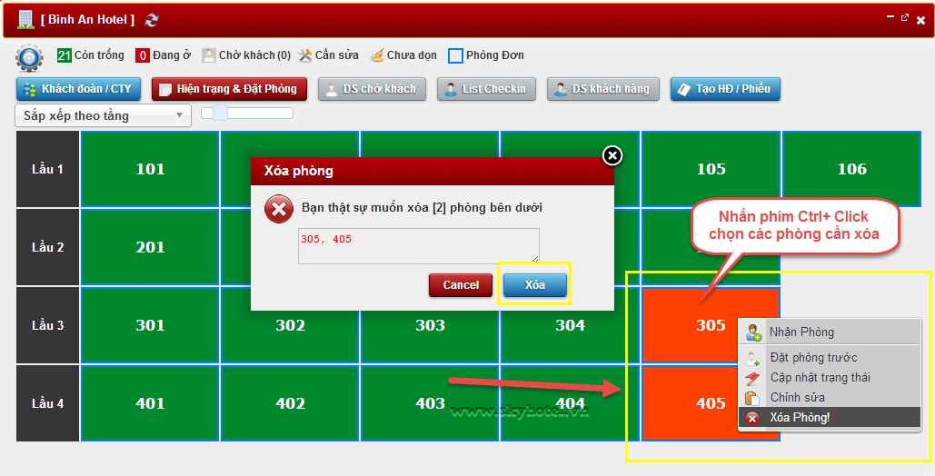 Vào sơ đồ khách sạn > Nhấn giữ phím Ctrl + click các phòng cần xóa > Xóa phòng