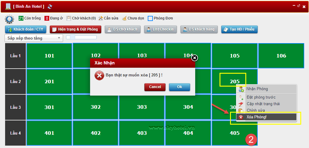 Vào sơ đồ khách sạn > Click vào phòng cần xóa > Xóa Phòng