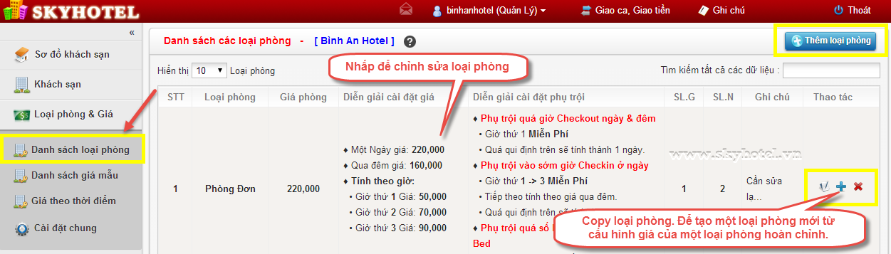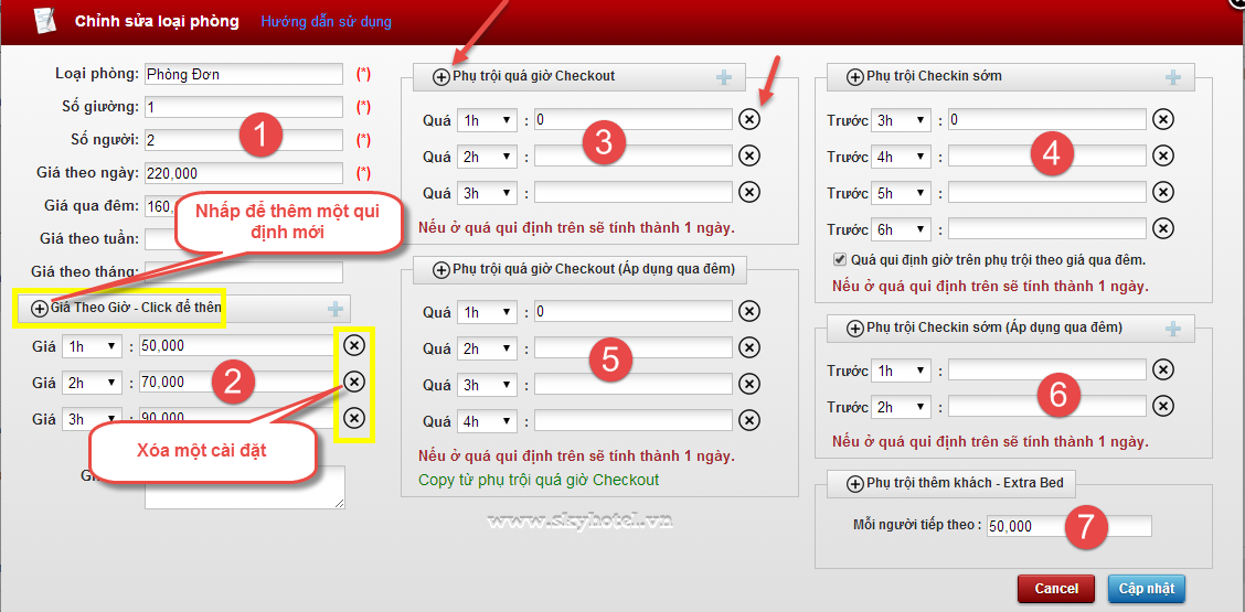 Tùy theo từng khách sạn sẽ có những cách cài đặt khác nhau. Ví dụ tùy theo khách sạn mà có cài đặt giá bán theo giờ, qua đêm...Bạn có thể xóa các cài đặt mà khách sạn không sử dụng.