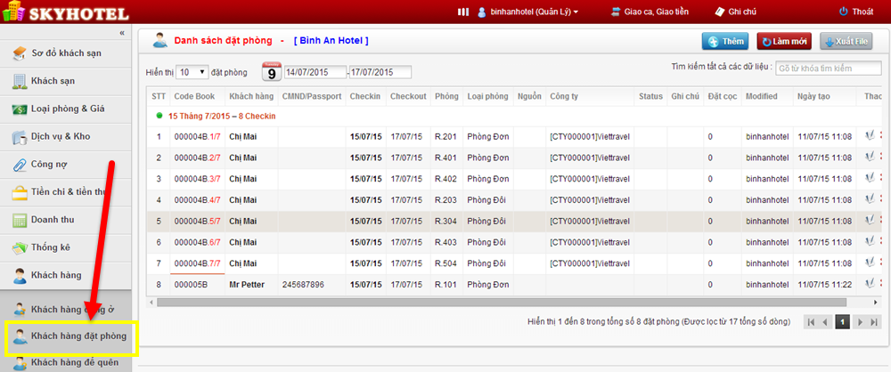 Xem danh sách đặt phòng để kiểm tra lại. vào menu Khách hàng > Khách hàng đặt phòng