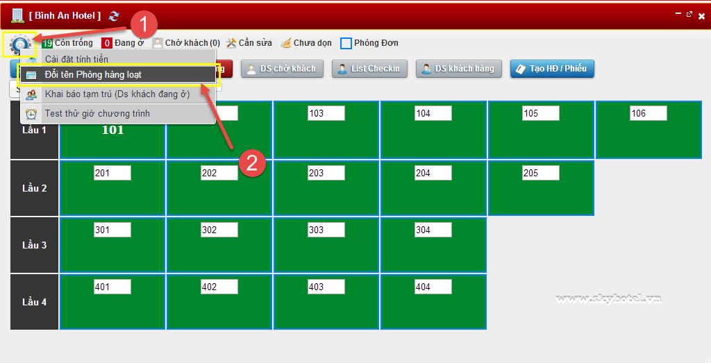 Vào sơ đồ khách sạn > Click vào nút setting > Đổi tên phòng hàng loạt > Gõ lại tên các phòng