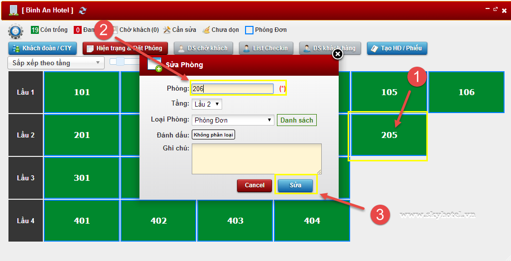 Vào sơ đồ khách sạn > Nhấp vào phòng cần sửa tên > Nhập tên phòng > Sửa