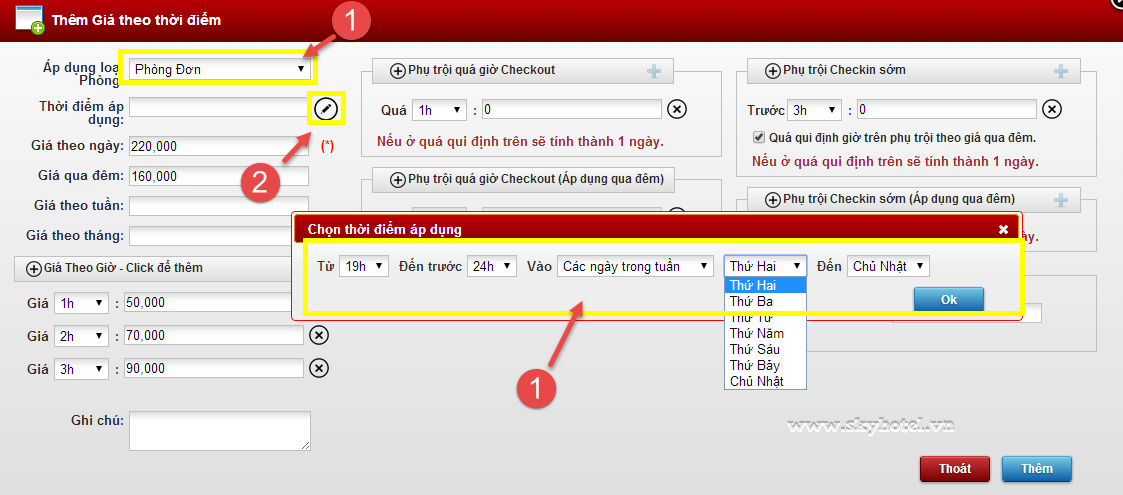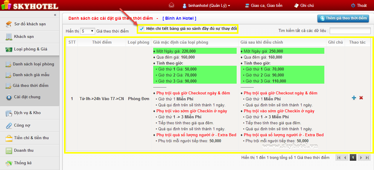 Như ví dụ trên: Đối với các phòng đơn, khi khách nhận phòng vào thứ 7 và CN sẽ tính giá một ngày là 250k thay vì 220k, giá bán giờ cũng thay đổi từ 50k tiếng đầu tiên -> 70k, tương tự tiếng thứ 2 và thứ 3...Bạn có thể Tick vào "Hiện chi tiết bảng giá so sánh đầy đủ sự thay đổi." để hiện đầy đủ các qui định giá:
