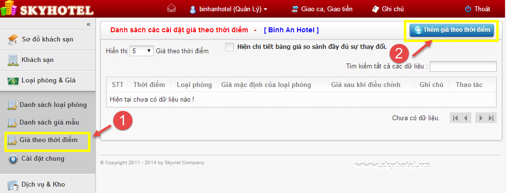 Vào menu Loại phòng & Giá > Giá theo thời điểm: