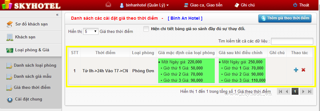 Giá mặc định của phòng đơn: giá ngày: 220k, giờ 90k (Cài tại danh sách loại phòng)
