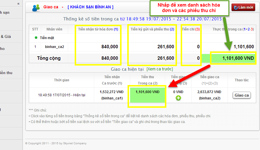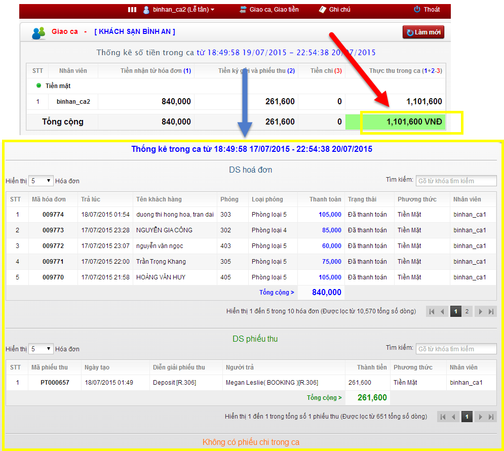 Kiểm tra lại các số tiền thu chi trong ca. Tiền giao ca = Tiền thu từ hóa đơn + Tiền từ Phiếu thu/Đặt cọc - Tiền chi