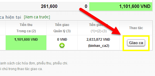 Nhấp nút giao ca. Tiền giao của ca trước sẽ thành tiền nhận từ ca trước của ca sau