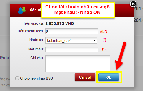 Trong bản xác nhận giao ca > Chọn tài khoản nhân viên nhận ca > Gõ mật khẩu > OK Lúc này phần mềm tự động thoát (Logout) ca cũ và đăng nhập (Singin) vào ca mới