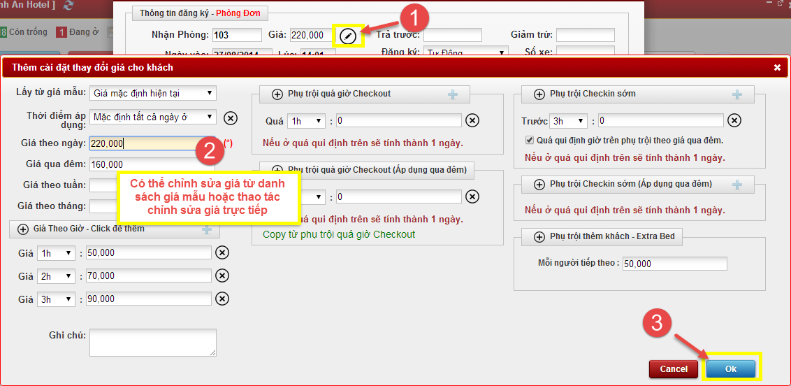 2. Cửa sổ linh động giá sẽ tải lại các qui định giá của phòng và bạn có thể chỉnh sửa lại được tất cả các qui định từ giá ngày, qua đêm, phụ trội... Có 2 cách để chỉnh sửa giá