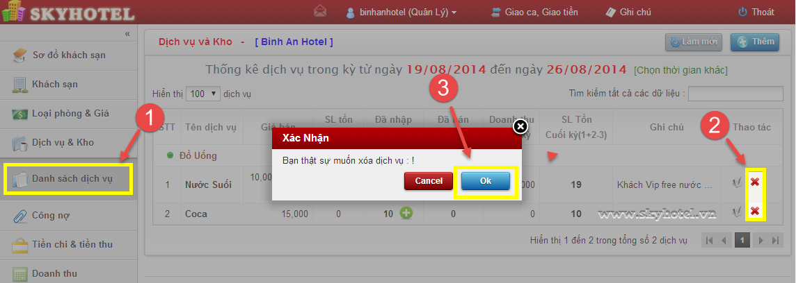 Vào menu Dịch vụ & Kho > Danh sách dịch vụ > Tại cột thao tác của dịch vụ > nhấp nút X để xóa dịch vụ