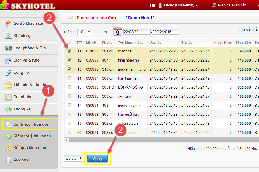 1. Vào Danh sách hóa đơn > Tick chọn các hóa đơn cần xóa > nhấn nút Apply bên dưới để xóa hóa đơn